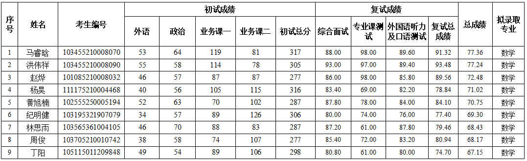 经考生初试、复试等各个环节,学院招生工作领导小组确认,现对拟录取的考生进行公示(详见下表),公示时间为2025年4月10日至4月16日(7天),如有疑义,请以书面的形式反映,反映问题要实事求是,署本人真实姓名。
