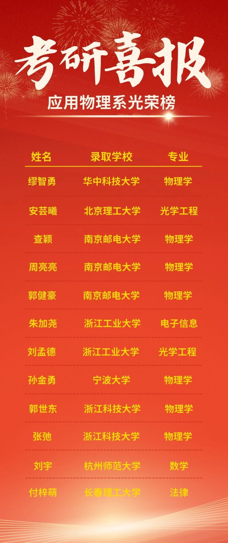 杏坛吐馥结硕果,兰台振翼报佳音。在2025年全国硕士研究生招考中,51吃瓜 应用物理系共计12位学子被华中科技大学、北京理工大学、南京邮电大学、浙江工业大学等高校成功录取。(文稿来源:浙科物理)