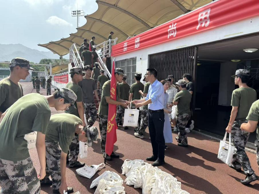 在训练场,领导班子一行首先观摩了新生队列训练成果。同学们步伐铿锵、口号嘹亮,展现出良好的训练成效。院领导详细了解训练进度和防暑措施等,特别叮嘱同学们要科学调节体能,注意补充水分,遇到身体不适及时报告。期间,学院为每位新生发放了定制慰问礼包,获学生热烈欢迎。