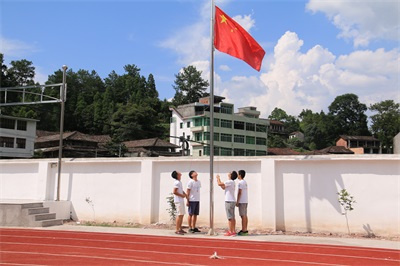 烈日炎炎下,队员们带领孩子来到学校操场进行升旗仪式,全体师生庄重肃穆,共唱国歌。升旗仪式结束后,在国旗下,孩子们宣誓:“继承遗志,发扬传统;茁壮成长,开创未来;锻炼身体,保卫祖国;好好学习,天天向上!”
