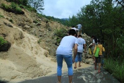 台风刚过,先锋队所在的中心学校里一片狼藉。拿上扫把和水桶,队员们开始打扫校园,这是孩子们的乐园也是我们的“家”,我们要打扫干净来迎接孩子们的到来。就在我们挥洒汗水,迎战风雨之时,数日未开的学校大门外传来了熟悉的声音。天空还下着小雨,可是一把把雨伞下,孩子们竟满是愉悦的笑脸,开口的第一句话竟然是“老师,可以把教室的门打开上课吗?”雨下的队员们眼眶微红,但是感动之余队员们更加关心孩子们的安全。台风刚过,山路泥泞,滑坡频发,孩子们来回的路上会遇到怎样的危险,队员们想都不敢想。反应过来的队员们忍痛拒绝了上课的请求,而是马上组织人员送孩子们回家。在送孩子们回去的路上,一处道路因为泥石流滑坡已经封锁了道路,巨大的缺口依然散发着危险的气息。“孩子们是怎么过来的?”队员们再一次被孩子们的执着感动,这是一群多么天真,多么可爱的“小妖精”。