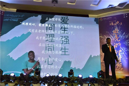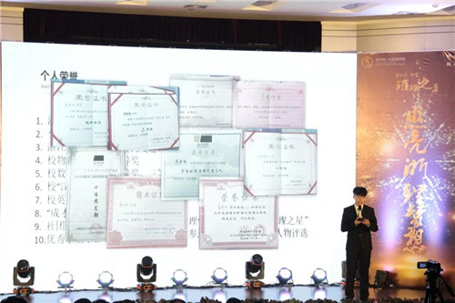 云本胜老师、施英老师、石大力老师获得优秀教师奖,王长荣老师获得特别贡献奖。已然退休年龄的王长荣老师依然在三尺讲台上燃烧自己。在现场,他用一首诗表达了他内心的激动与喜悦。
