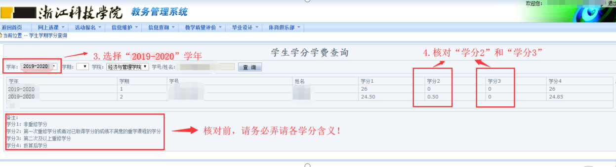 核对内容:2019-2020学年1学期和2学期的学分2和学分3。(其他学年学期本次不核对、不缴费)