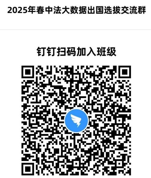 报名同学请扫码加2025年春中法大数据出国交流学习选拔钉钉群,填写报名表,并提交法语等级考试成绩单。