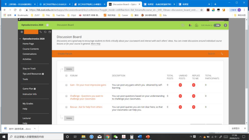 课程开始前做平台的调研(首选比较稳定的最好全英文),比较理想的是钉钉、zoom和雨课堂平台。当时2月份全国网课开始后总结开始的网课卡顿经验,考虑到大陆这边大学普遍采用QQ群视频方式而中小学多数采用钉钉,所以本人就采用相对大陆用的少的zoom平台以避免课上卡顿的几率发生。当然后来钉钉经过阿里云的几轮扩容后几乎没有卡顿情形成为了备选,QQ群视频/直播也在腾讯的扩容下运行平稳就是对于留学生新申请QQ号过程相当困难所以最后放弃了。