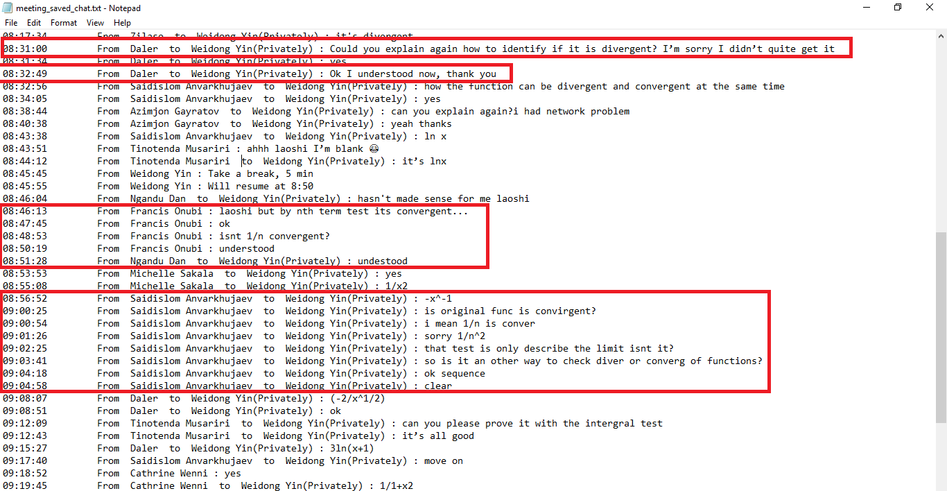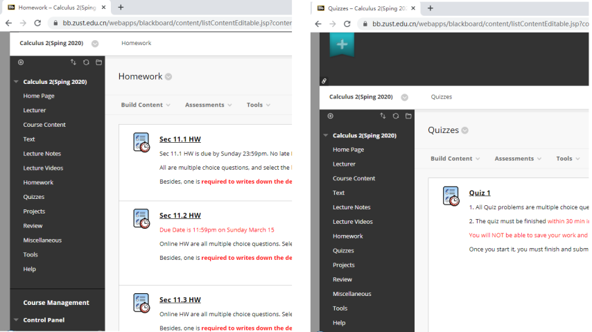 在教师方面, Calculus 2的课,我用的是Blackboard平台. 平台本身不错, 但是校园网的防火墙极度粗糙的过滤方式, 严重影响师生正常工作、学习(尤其是开学第一、二周问题最严重). 经常出现的情况是,我在正常更新课程网站,突然校园网把我屏蔽了;我在正常改学生线上作业,输入评论,校园网把我屏蔽了;我在上传课程视频,校园网把我屏蔽了;有的国际学生想要登陆平台做作业,校园网把他屏蔽了…….对此问题, 向学校反映过多次(比如, 学校第一周网课的调查反馈表,我填了2次,反映这个问题);教务处的贾瑾老师,还有Blackboard的客服肖禾佳,都非常负责,给了我很多帮助.