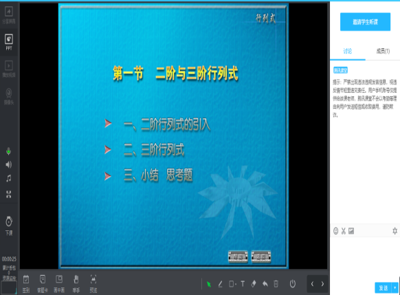 Ø 课中:主要采用腾讯课堂直播功能进行课堂直播教学。腾讯课堂支持在线即时互动教学,提供流畅、高音质的课程直播效果;支持PPT演示,白板书写、屏幕分享,画中画、视频播放等多样化的授课模式。同时支持游客模式,便于督导组随时听课。我会在直播授课过程中,穿插提问,而学生会在右侧的对话框文字互动,或使用举手功能上台语音回答问题。为了避免教学过于枯燥,我还会在课间播放音乐让学生轻松一下。