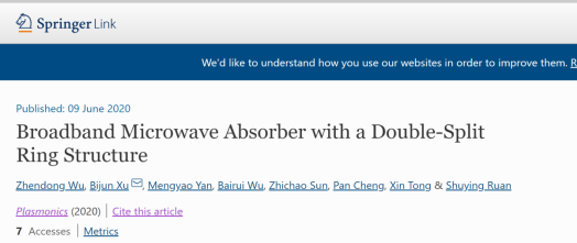 2017级应用物理学本科生吴震东同学在徐弼军老师指导下以第一作者身份在国际知名期刊《Plasmonics》(IF=2.926,中科院三区)发表了一篇高质量学术论文,报道了他们在超材料的吸收损耗特性最新研究成果。浙江科技学院为第一署名单位,徐弼军老师为论文通信作者。