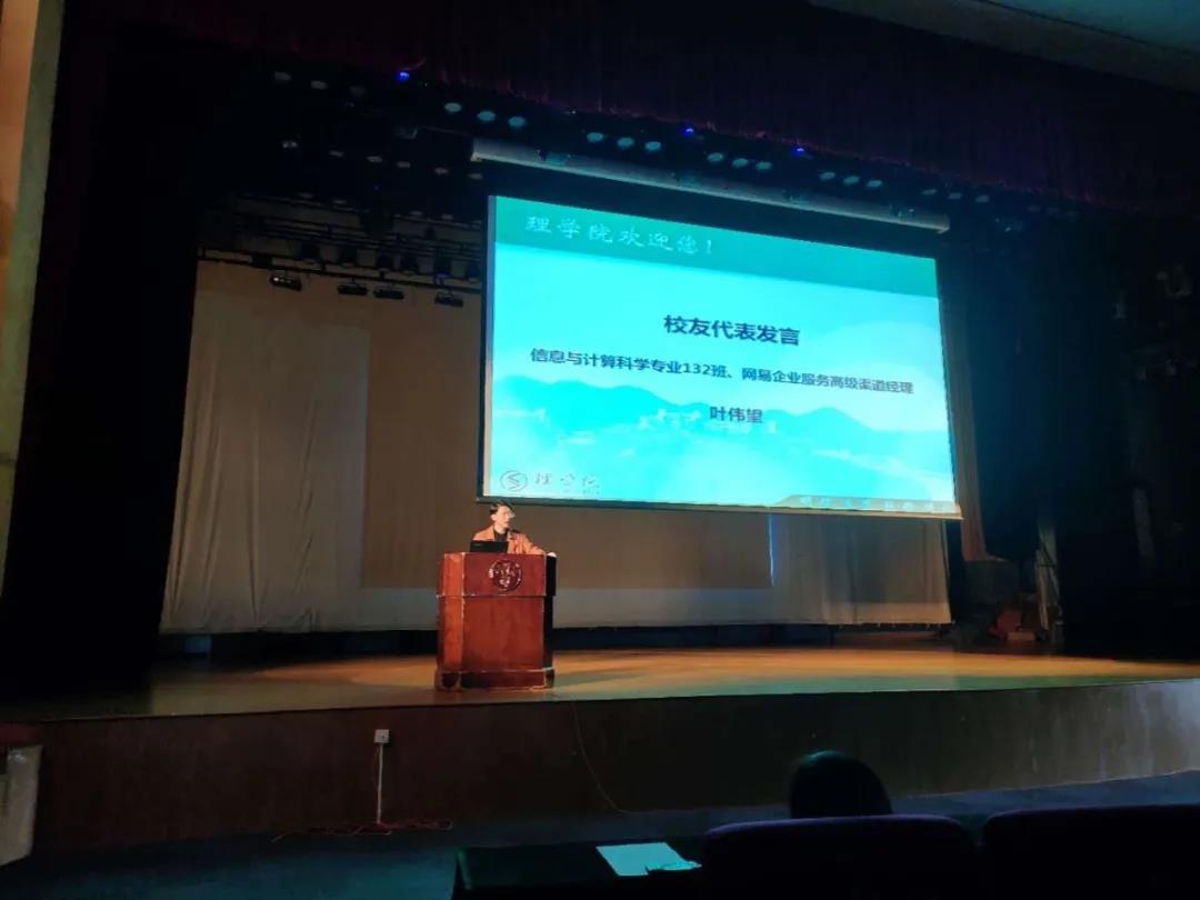 在一片掌声中,理学院/大数据学院17届毕业生,信计132班叶伟望,现任网易企业服务高级渠道经理作为校友代表发言。“大学是我们绽放青春最好的舞台”,因此他向新生讲述了大学生活应该如何度过,如何在这个舞台上展现自我。叶伟望鼓励大家提高自我认知能力、多参加社交活动、在学好专业知识的前提下培养有意义的爱好等。