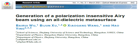应用物理系2019级研究生吴白瑞同学在徐弼军指导下以第一作者身份在美国光学学会旗下的国际知名学术期刊《Optical Materials Express》(影响因子3.064,中科院二区)上发表一篇高质量学术论文,报道了他们在超构表面产生特殊光束的最新研究成果。浙江科技学院为第一署名单位,徐弼军老师为论文通信作者。