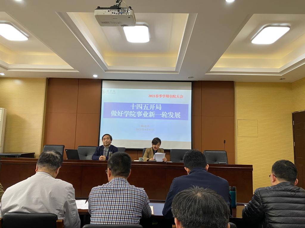 415日下午, 院在A4-216会议室召开全院教职工大会暨教职工政治理论学习大会,传达学习习近平总书记重要讲话和学校相关会议精神。学院班子成员及全体教职工参加此次会议会议校党委委员/院长陶祥兴主持。