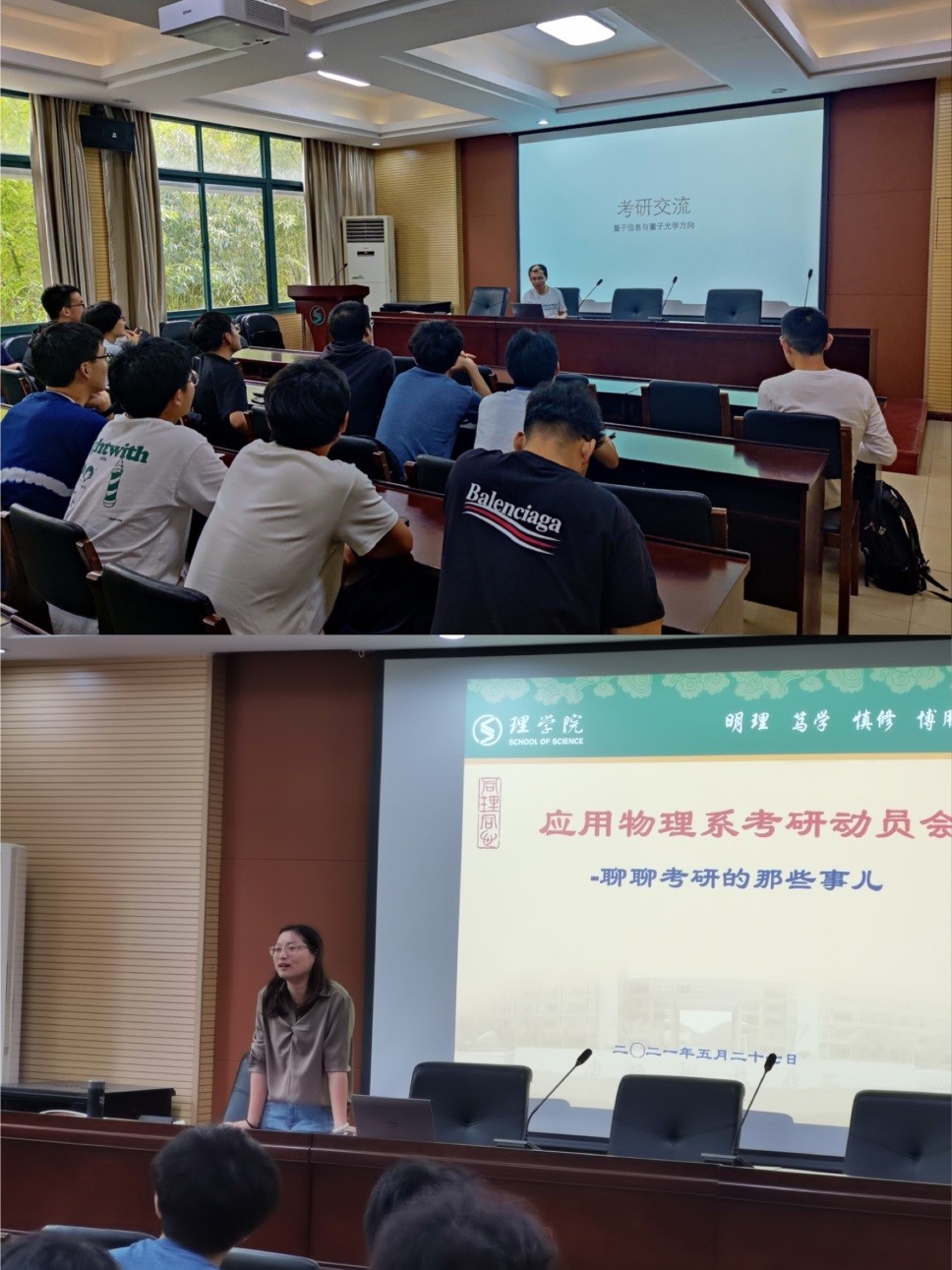 2021527日下午,应用物理系举办了以“聊聊考研那些事儿”为主题的考研动员会。2018级、2019级本科生积极参加了本次动员会。动员会由系副主任江红民教授主持,青年博士黄喆、王海龙、颜益营、俞昕宁和王艳老师参加了动员会的交流环节。