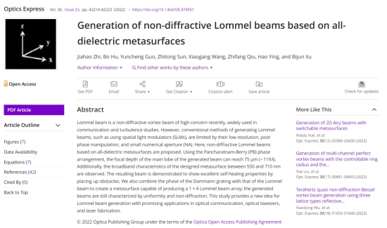 徐弼军教授指导的应用物理系2021级研究生职佳浩同学以第一作者身份在美国光学学会旗下(OSA)著名学术期刊《Optics Express》(影响因子3.894,JCR一区,中科院二区)上发表了题为“Generation of non-diffractive Lommel beams based on all-dielectric metasurfaces”的研究论文,浙江科技学院为第一署名单位,应用物理系徐弼军为论文通讯作者。