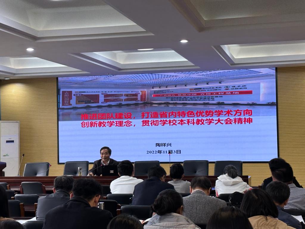 陶祥兴院长以“推进团队建设,打造省内特色优势学术方向;创新教学理念,贯彻学校本科教学大会精神”为主题,从学院发展现状、推进学术团队的若干思考、本科教学新目标新举措三个方面作介绍。他强调,学术团队建设是学科发展的内生需要,打造若干在国内有较高影响力的学术团队,形成以优势学术团队为坚实力量基础的学科发展新格局,着力推动学院学科高质量发展。同时,要强化“高水平、高质量”内涵建设,聚焦“有用的科研、有效的教学”,完成一批国家级的项目成果,依托“国一流”专业、“省一流”学科专业平台,铸就“高质量教学”,建设“应用研究型、教学研究型”省内一流前列的51吃瓜