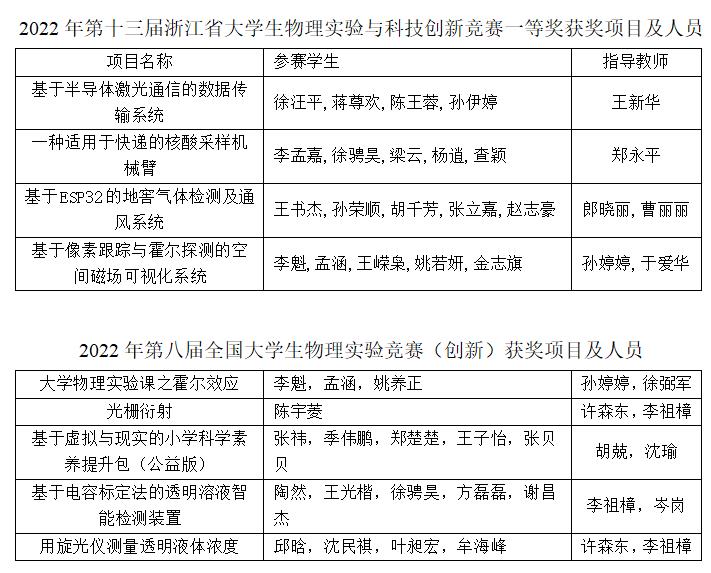 近日,浙江省第十三届大学生物理科技创新竞赛和全国大学生物理实验竞赛(创新)赛双双落下帷幕。我校选手发挥出色,省赛共参赛20项作品,获奖18项,其中一等奖4项、二等奖6项、三等奖8项,一等奖获奖数量位居全省前列。国赛共参赛5项,获奖5项,其中三等奖1项、优秀奖4项。
