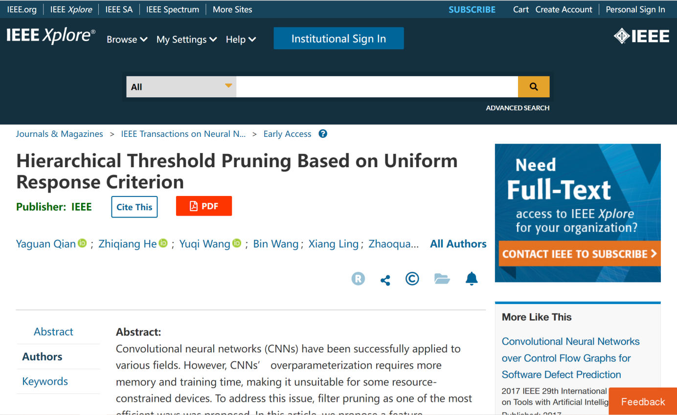 机器学习与数据科学团队(人工智能安全课题组)一篇论文《Hierarchical Threshold Pruning Based on Uniform Response Criterion》在人工智能领域顶级期刊IEEE Transactions on Neural Networks and Learning System上发表。IEEE TNNLS是人工智能领域的旗舰期刊,中科院一区,最新SCI影响因子为14.255。论文以我校为第一单位,钱亚冠老师为第一作者,与浙江省多维感知重点实验室、中科院软件所、哈工大(深圳)、电子科大湖州研究院等单位共同合作完成。论文提出新的剪枝策略,克服了深度神经网络剪枝过程中的层崩塌问题,使得神经网络在极低的剪枝率下仍能保持层间连接的完整性。
