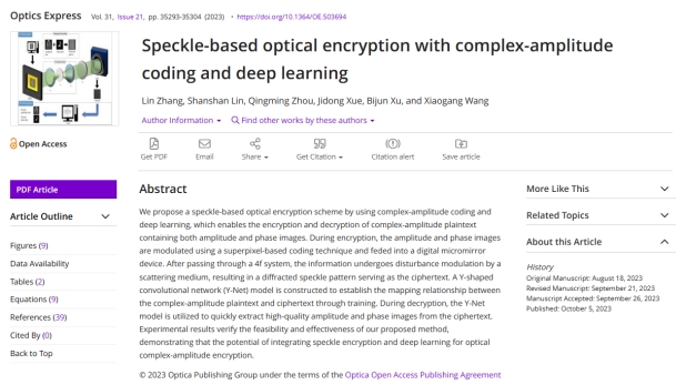 院光子与光场调控研究团队在光学图像安全处理研究方面取得重要进展,相关研究成果以论文形式发表在国际光学领域知名期刊《Optics Express》(影响因子3.8,中科院SCI二区,JCR Q1)上。论文题为“Speckle-based optical encryption with complex-amplitude coding and deep learning”,应用物理系2021级研究生张琳为第一作者,汪小刚教授和徐弼军教授分别为论文通讯作者和共同指导教师,浙江科技学院为第一署名单位。