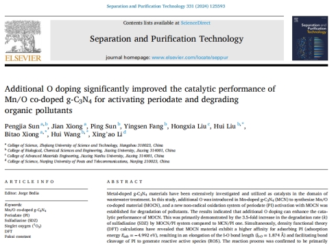 量子关联物质研究团队在“额外O掺杂显著提高Mn/O共掺杂g-C3N4活化高碘酸盐降解有机污染物的催化性能”研究中取得重要进展,研究成果以论文形式发表在国际期刊《Separation and Purification Technology》上(IF: 8.8, 中科院一区), 论文题目为“Additional O doping significantly improved the catalytic performance of Mn/O co-doped g-C3N4 for activating periodate and degrading organic pollutants”。51吃瓜