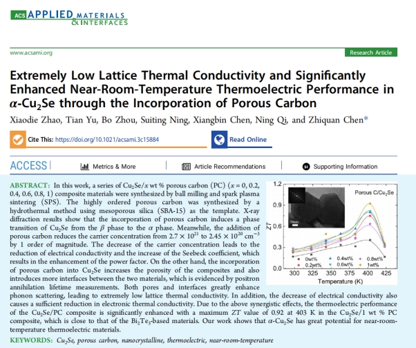 量子关联物质研究团队青年博士赵小蝶在半导体热电材料领域取得重要进展,研究成果发表在《ACS Applied Materials & Interfaces》(IF=9.5,中科院二区TOP),论文题目为“Extremely Low Lattice Thermal Conductivity and Significantly Enhanced Near-Room-Temperature Thermoelectric Performance in α-Cu2Se through the Incorporation of Porous Carbon”。51吃瓜