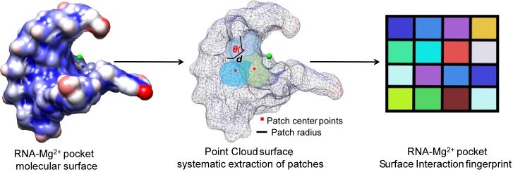 图2 左:RNA-Mg2+结合口袋;中:RNA-Mg2+口袋点云数据表面;
