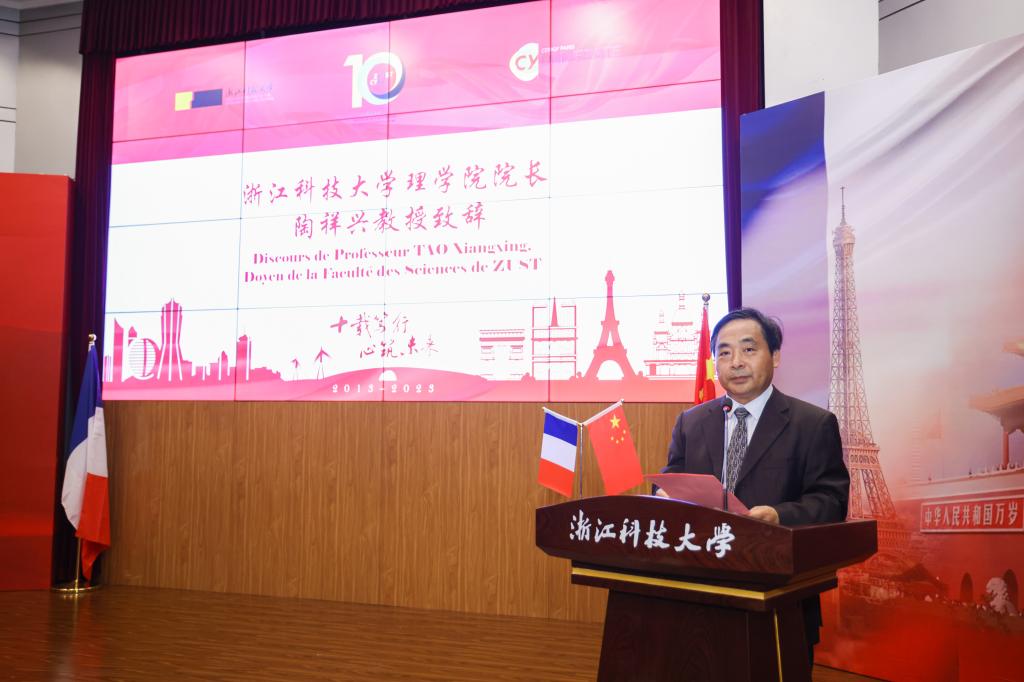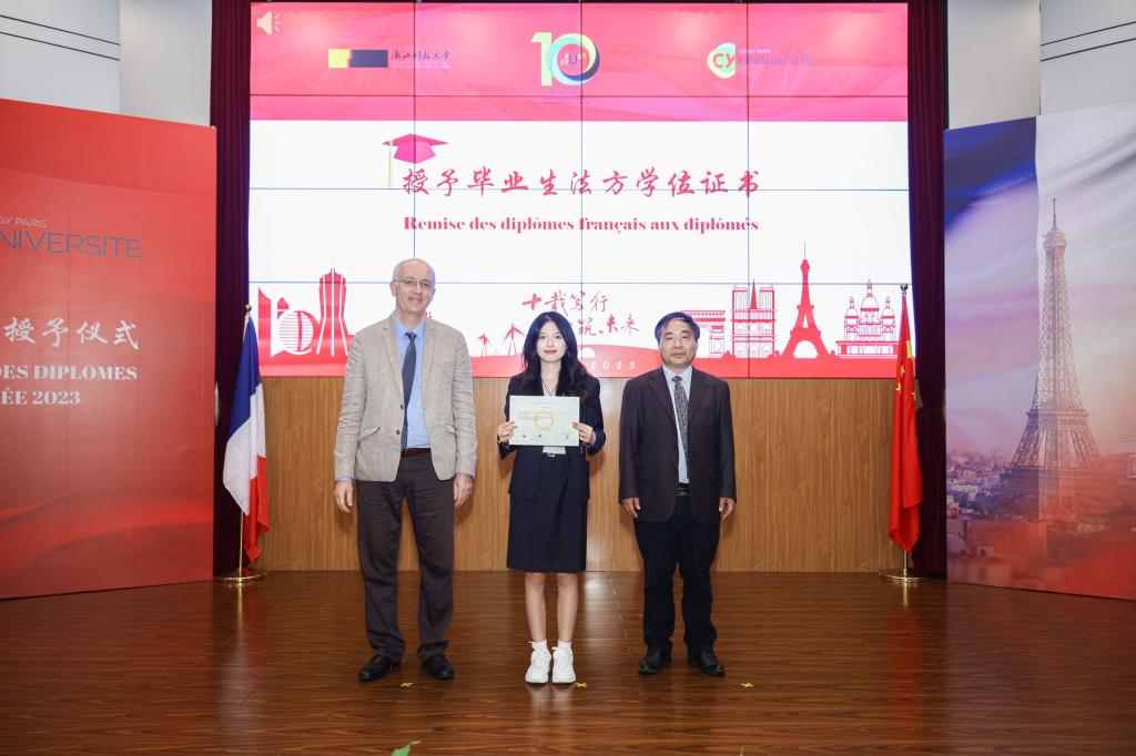 院长陶祥兴教授代表学院在仪式上致辞,希望同学们继续做中法文化交融的杰出使者,祝愿所有毕业生前程似锦、鹏程万里!此外,法国高等教育署上海中心负责人、高等教育合作副专员南子跃(Olivier Perez)以及法国高等教育署杭州办事处负责人耿雪婷出席此次典礼。典礼最后,项目学生与法国外教共同合唱法语歌曲,赢得了全场的热烈掌声和喝彩。