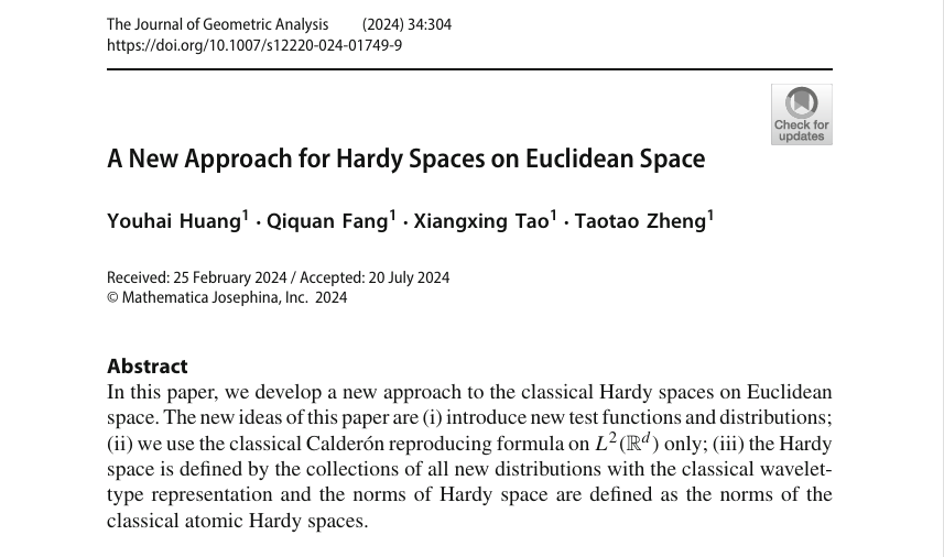 1. A new approach for Hardy spaces on Euclidean space, J. Geom. Anal. 34, 304(2024) (中科院2区, 数学类T2) //doi.org/10.1007/s12220-024-01749-9