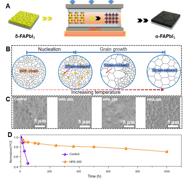图2 (a)热压退火过程示意图 (b)钙钛矿薄膜高温重结晶过程(c)不同温度下热压退火薄膜SEM图 (d)钙钛矿太阳能电池在在85℃和85% 相对湿度的稳定性测试