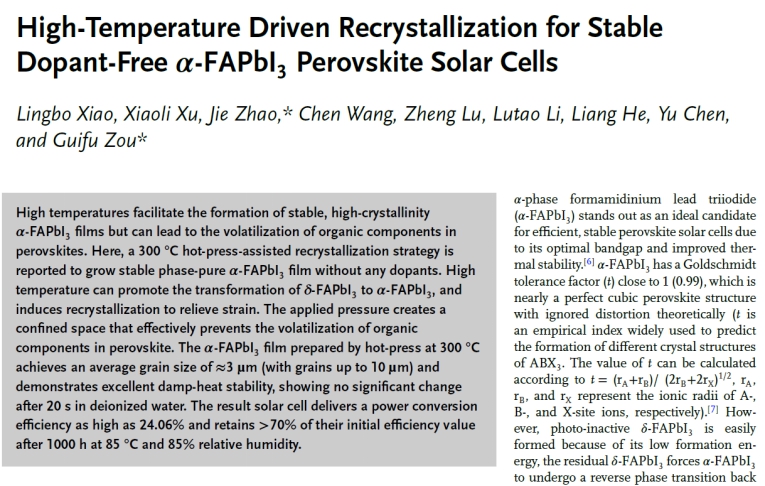 应用物理系软物质与功能纳米材料研究团队在国际TOP学术期刊《Advanced Science》(IF=14.3,中科院一区TOP)期刊上发表了题为"High-Temperature Driven Recrystallization for Stable Dopant-Free α-FAPbI3 Perovskite Solar Cells"的研究论文。51吃瓜