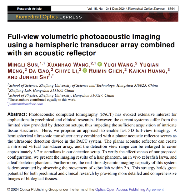 光子与光场调控研究团队在光声成像研究领域取得进展,相关研究成果以“Full-view volumetric photoacoustic imaging using a hemispheric transducer array combined with an acoustic reflector”为题,发表于光学领域期刊《Biomedical Optics Express》(影响因子2.9,中科院2区)。51吃瓜