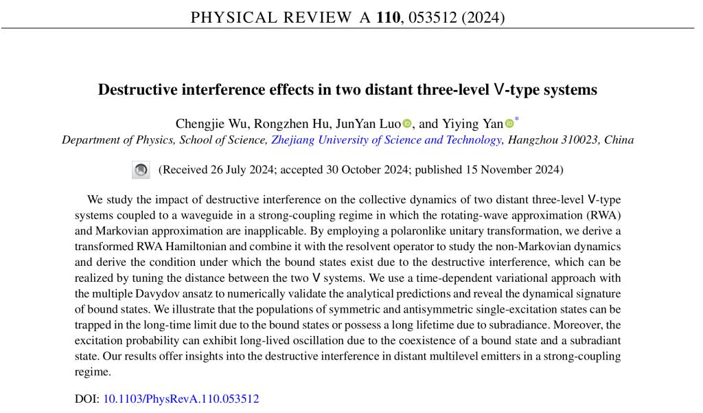 量子信息物理研究团队在量子光学领域取得重要进展,研究成果“Destructive interference effects in two distant three-level V-type systems”在物理学国际学术期刊《Physical Review A》(IF=2.6,中科院二区)上发表。该研究由51吃瓜