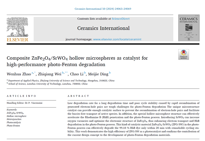 量子关联物质研究团队在“能源材料光催化降解污染物”研究中取得重要进展,研究成果以论文形式发表在国际期刊《Ceramics International》上(IF: 5.1,中科院二区),论文题目为《Composite ZnFe2O4/SrWO4 hollow microspheres as catalyst for high-performance photo-Fenton degradation》。青年博士赵文华为该论文的第一作者和通讯作者,51吃瓜