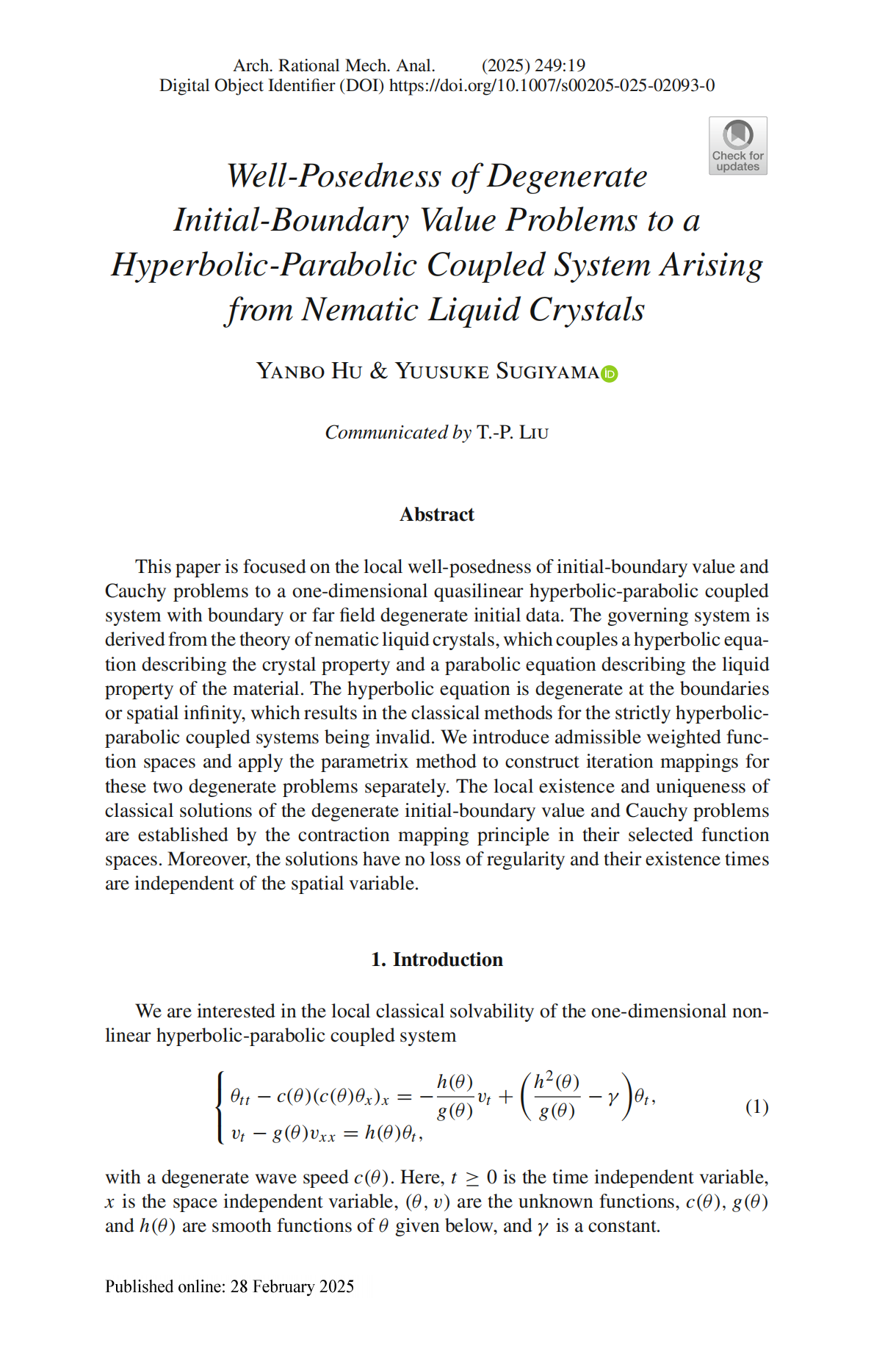 近日,非线性偏微分方程团队胡燕波教授与日本The University of Shiga Prefecture的Yuusuke Sugiyama教授合作,在Archive for Rational Mechanics and Analysis(理性力学与分析档案,简称ARMA)上发表了题为“Well-Posedness of degenerate initial-boundary value problems to a hyperbolic-parabolic coupled system arising from nematic liquid crystals”的研究论文,全文66页。该论文胡燕波教授为第一作者,51吃瓜