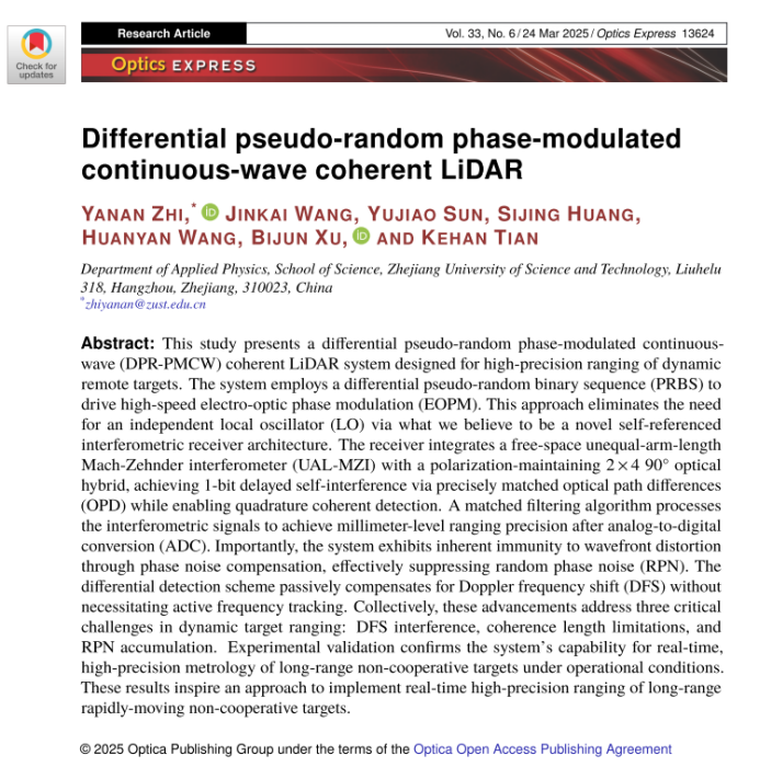 应用物理系光子与光场调控研究团队在相干激光雷达研究方面取得重要进展,相关研究成果以研究论文形式发表在国际光学领域知名期刊《Optics Express》上。论文题为“Differential pseudo-random phase-modulated continuous-wave coherent LiDAR”,全文23页,附图11张,约3.3万字。职亚楠副研究员为论文第一作者/通讯作者,研究生王金凯为第二作者,其他作者依次是孙玉娇、黄思婧、王欢颜、徐弼军教授和田克汉教授,51吃瓜