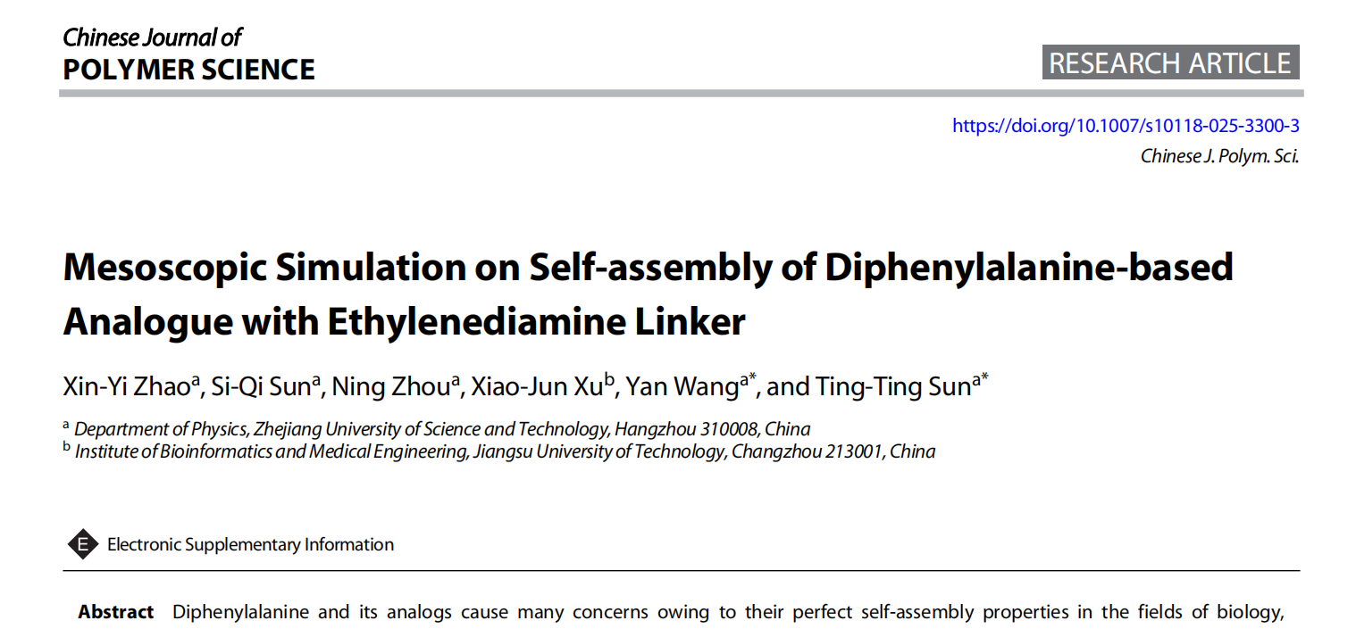 软物质与功能纳米材料研究团队在“短肽衍生物自组装领域”取得重要的研究进展,相关研究成果以浙江科技大学为第一单位在国际期刊《Chinese Journal of Polymer Science》(IF = 4.1,中科院SCI二区,JCR Q1)上,在线发表题目为“Mesoscopic Simulation on Self-assembly of Diphenylalanine-based Analogue with Ethylenediamine Linker”的论文。物理学硕士研究生赵欣怡为该论文第一作者,应用物理系王艳博士和孙婷婷教授为共同通讯作者,51吃瓜