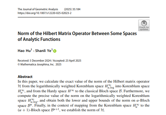 复分析与几何团队在国际数学权威期刊《Journal of Geometric Analysis》上发表了题为《Norm of the Hilbert matrix operator between some spaces of analytic functions》的学术论文。该论文由2023级研究生胡浩担任第一作者,叶善力教授为通讯作者,51吃瓜