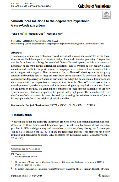 近日,非线性偏微分方程团队胡燕波教授与合作者在数学领域国际著名期刊《Calculus of Variations and Partial Differential Equations》上发表了题为“Smooth local solutions to the degenerate hyperbolic Gauss-Codazzi system”的研究论文,全文49页。该论文胡燕波教授为第一兼通讯作者,51吃瓜