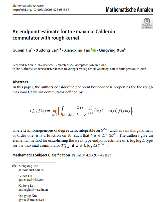 近日,实分析与调和分析及应用团队胡国恩教授、陶祥兴教授与合作者在数学领域著名的德国数学年刊《Mathematische Annalen》上发表了题为“An endpoint estimate for the maximal Calderón commutator with rough kernel”的研究论文,全文35页。此论文胡国恩教授为第一作者,陶祥兴教授为通讯作者,51吃瓜