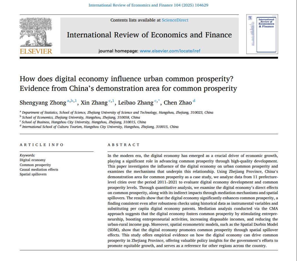 近日,应用统计与金融数学团队钟声扬博士与合作者在经济/金融领域权威期刊《International Review of Economics and Finance》上发表了题为“How does digital economy influence urban common prosperity? Evidence from China’s demonstration area for common prosperity”的研究论文。此论文钟声扬博士为第一作者,51吃瓜