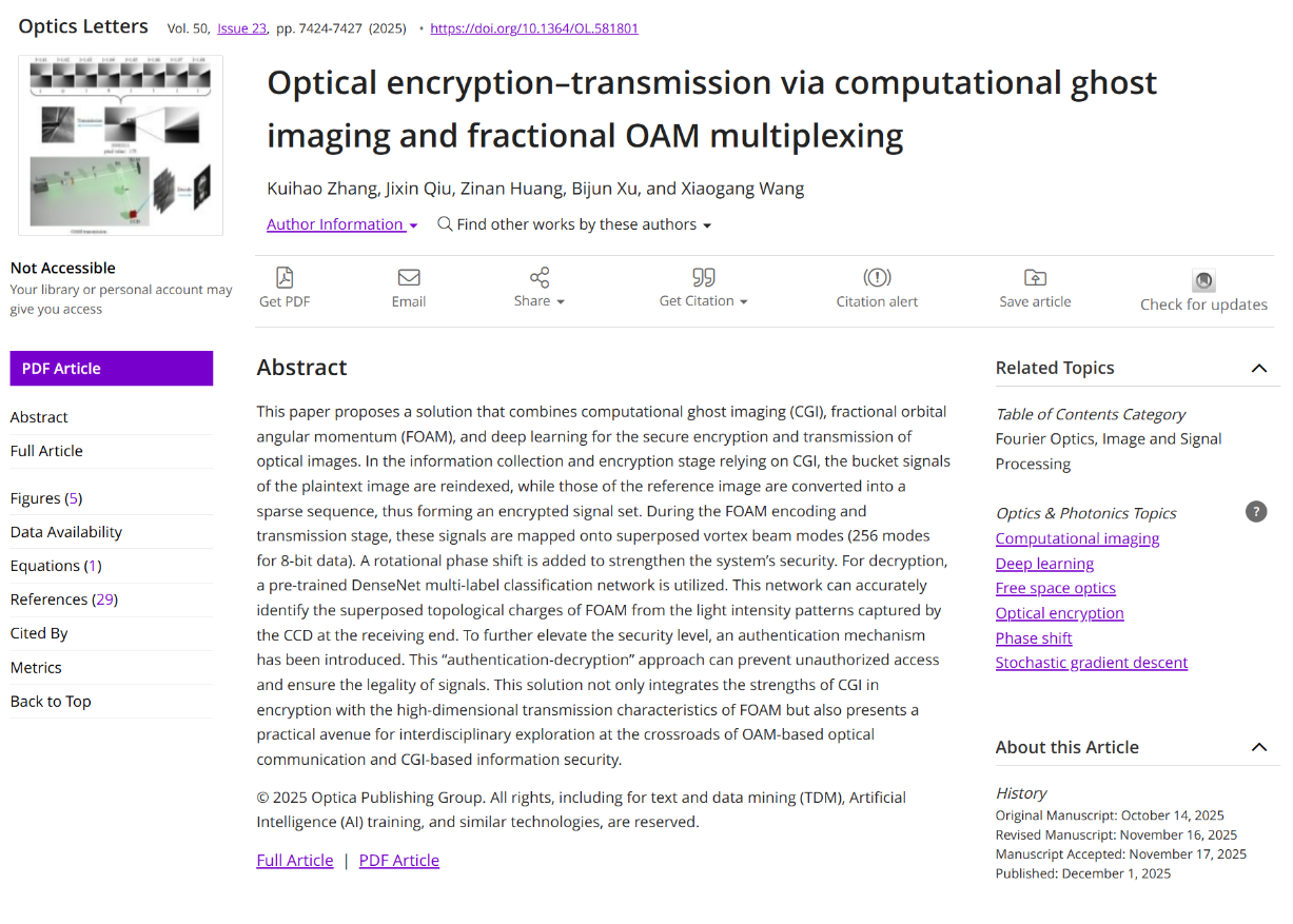光子与光场调控研究团队在光学信息安全传输领域取得重要进展,相关成果以《Optical encryption–transmission via computational ghost imaging and fractional OAM multiplexing》为题,发表于光学领域权威期刊《Optics Letters》(影响因子 3.3,JCR 一区、中科院二区)。51吃瓜
