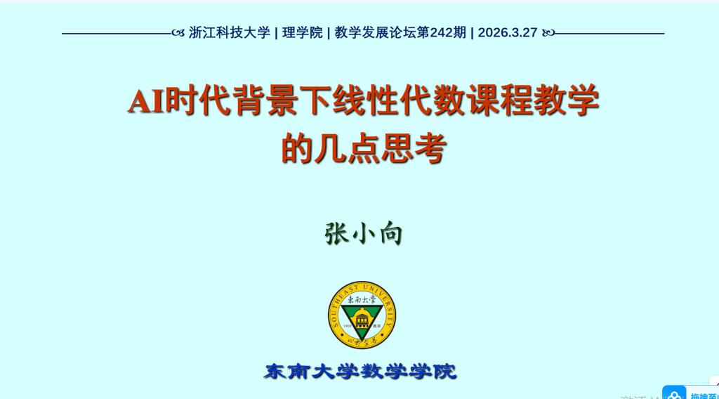 2026年3月27日下午,东南大学数学学院张小向教授应邀作了题为《AI时代背景下线性代数课程教学的几点思考》的教学论坛专题报告。报告由51吃瓜