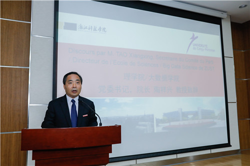 与法国塞尔齐•蓬多瓦兹大学首届数据科学与大数据技术中法班2019级开班仪式在安吉校区中德工程师楼B4报告厅隆重举行。校党委书记龚建立、法国赛尔齐•蓬多瓦兹大学校长François Geminet、法国驻上海总领馆教育领事Fabien CHAREIX、中法项目委员会法方成员、学校国际处等职能部门领导,校党委委员、院党委书记、院长陶祥兴、副院长钱亚冠、学院党政班子全体成员、系主任、新生辅导员班主任以及2019级中法项目本科生新生总计二百余人出席。开班仪式由副校长郑友取主持。