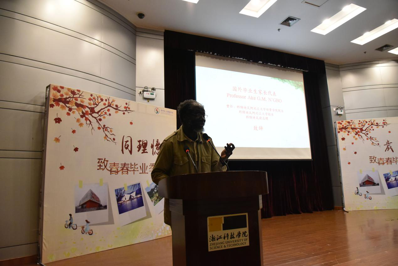 国外毕业生家长代表、科特迪瓦前总理 Professor Ake G.M. N'GBO在讲话中向学院院长、老师们以及其他工作人员们表示感谢,感谢他们为孩子们提供了良好的条件,创造了良好的学习氛围,同时, Professor Ake G.M. N'GBO也感谢了默默支持孩子的家长们。他对学院的快速发展表示赞赏和祝贺。他希望,在不久的将来,51吃瓜