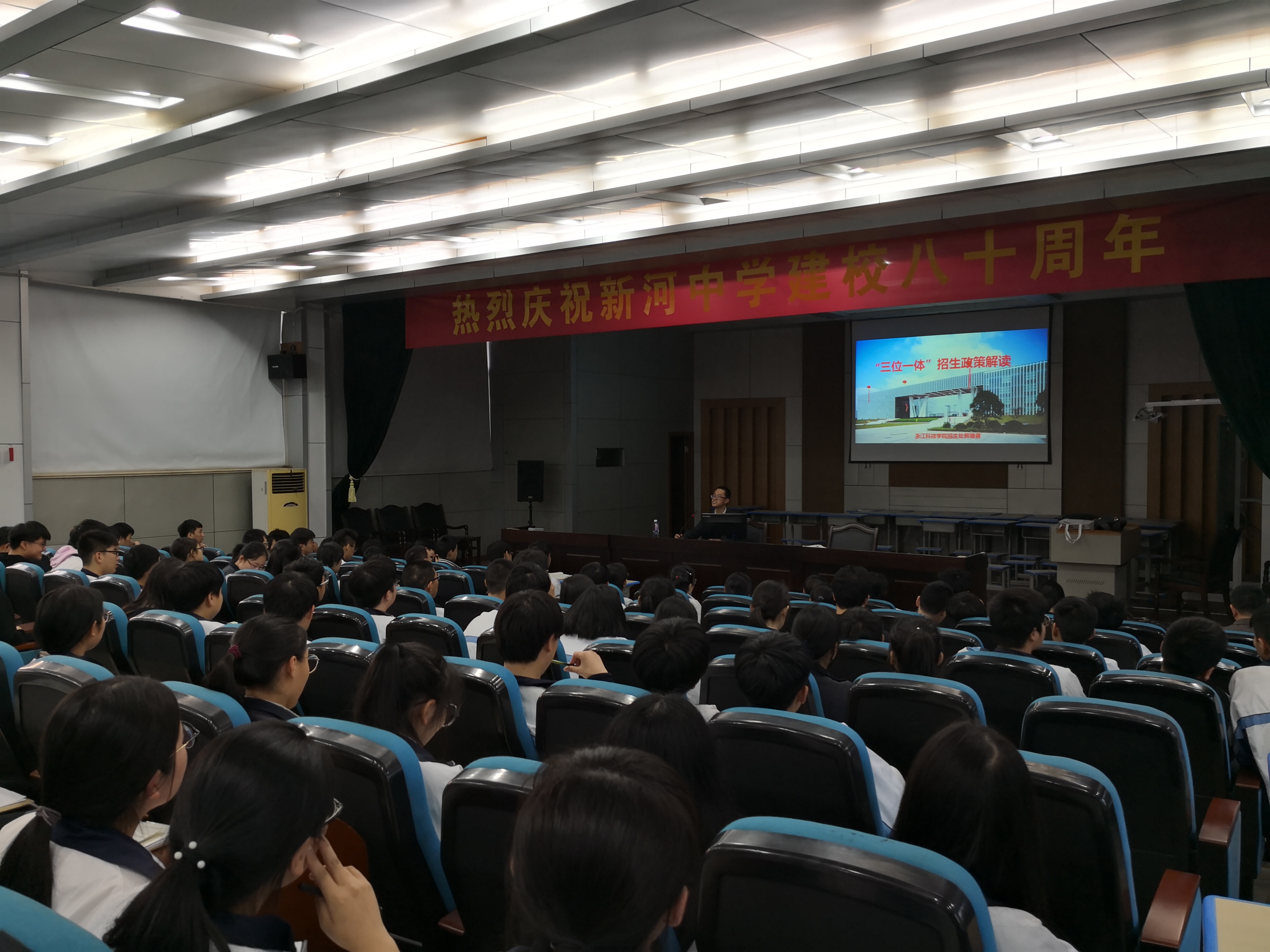党委委员王宝明和招就处招生主管郭增勇赴温岭新河中学开展招生宣传咨询活动。报名参加我校“三位一体”综合测试及有意向报考我校的200余名中学生参加了咨询宣讲会,新河中学教务办主任陶正出席并主持了本次咨询宣讲会。