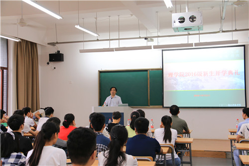 大会在庄严的国歌声中拉开帷幕。会上,院长陶祥兴发表了热情洋溢的致辞,他向刚跨入大学校园的新生们表示热烈祝贺,并代表学院全体教职工欢迎新生加入理学这个大家庭。也从多角度阐释大学与中学的区别,希望新生们尽快改变中学原有的学习生活模式,以适应全新的大学生活,并希望同学们在四年的学习中要树立自信,不断提升自己的学习能力、不断完善学习方法,制定好学习计划努力前行,把自己培养成为社会的有用人才。