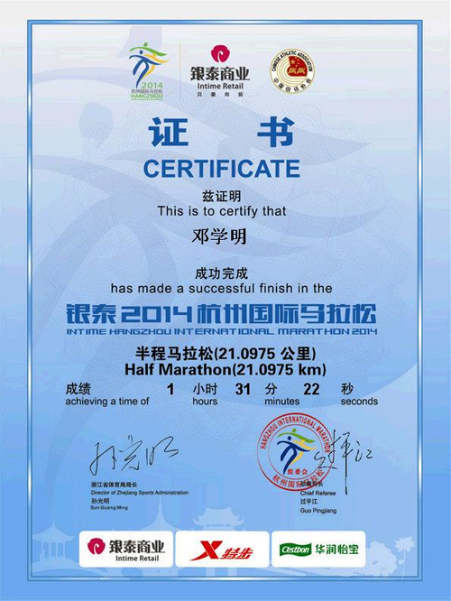 教师邓学明老师参加了2014杭州国际马拉松赛,并以1小时31分22秒的成绩获得半程马拉松(21.0975km)第14名的好成绩。约有5千人参加了半程马拉松比赛。目前,比赛认可的成绩是枪响成绩(枪响开始计时),净成绩是指运动员出发开始计时的成绩(通过身上带的芯片来确定时间的成绩)。邓学明这一成绩也比他2013年参赛成绩(第33名)有了较大的提高。