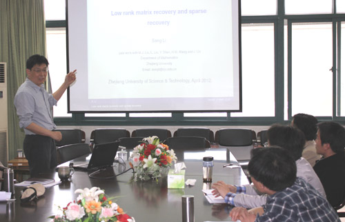 报告会上,李松教授首先介绍压缩传感理论的基本内容、基本工具,接着详细介绍与RIP相关的最新研究成果,讨论压缩传感中的一些重要问题,这些问题也是该研究领域中的基本核心内容。