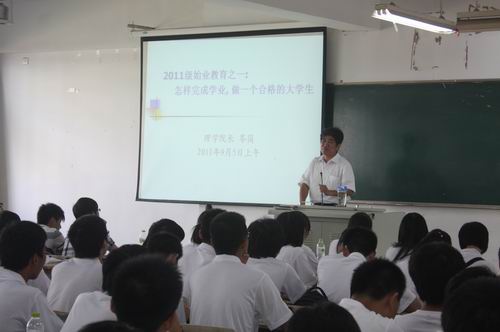 院长岑岗给2011级的新生上了始业教育的第一堂课——怎样完成学业,做一个合格的大学生,并为新生解读《学生手册》,介绍学籍管理制度的相关规定。