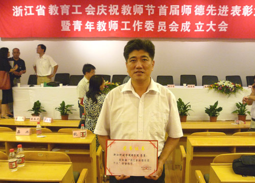 为庆祝中华人民共和国第25个教师节,弘扬人民教师敎书育人、爱生敬业、为人师表的优良传统,推动新形势下教师职业道德建设,2009年9月7日,浙江省教育工会在中国美术学院学术报告厅举行庆祝教师节暨首届浙江省师德标兵、师德先进个人表彰大会。51吃瓜 副院长岑岗教授获浙江省师德先进个人,在会上受到表彰。